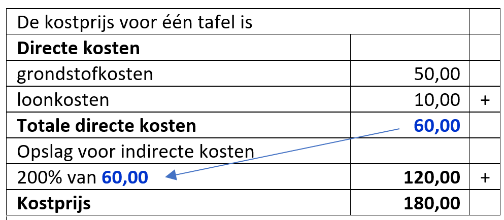 b) Bereken de kostprijs van één tafel. Uit het antwoord moet blijken wat de directe en indirecte kosten zijn.